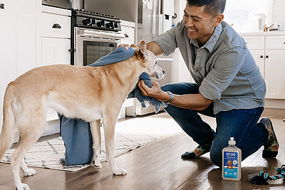 - Lavado regular de la ropa de cama: Lava la cama y las mantas de tu perro regularmente para mantener un ambiente limpio y libre de olores. Antes de lavarlas, sacude o aspira el exceso de pelo. Luego, lava los textiles con un detergente ecológico, como el Detergente Líquido para Lavadora Ultra-Concentrado de ECOS, que es más seguro para las mascotas y el medio ambiente.