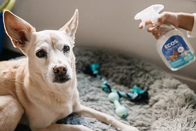 - Eliminación de manchas y olores: Para manchas difíciles o persistentes, aplica el Quitamanchas y Olores de Mascotas de ECOS. Esta fórmula utiliza enzimas naturales para descomponer y eliminar manchas y olores, asegurando que la cama de tu perro se mantenga fresca y limpia.
